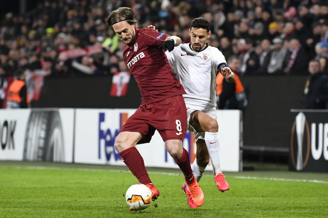 Damjan Djokovic (S), de la CFR Cluj, suteaza in timpul meciului de fotbal contra echipei Sevilla, din 16-imile Europa League, mansa tur, disputat pe stadionul Dr. Constantin Radulescu din Cluj-Napoca, joi, 20 februarie 2020. FLAVIU BUBOI / MEDIAFAX FOTO