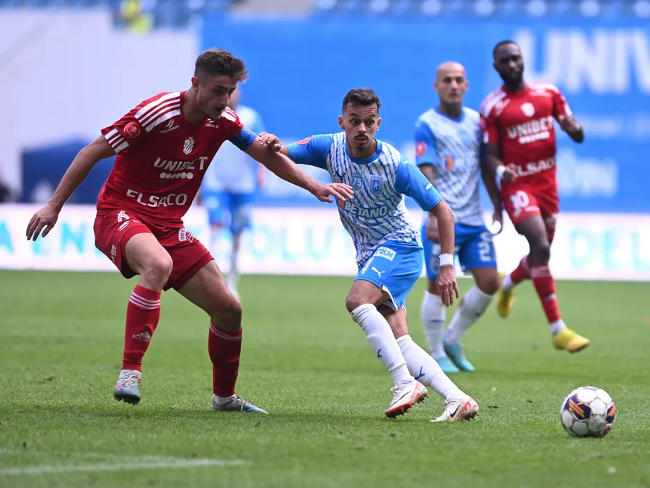 Victor Robert Dican si Lyes Hafid Houri in meciul de fotbal dintre Universitatea Craiova si FC Botosani, contand pentru Superliga Superbet, desfasurat pe Stadionul Ion Oblemenco din Craiova, duminica 1 octombrie 2023. © FOTO:Razvan Pasarica/SPORT PICTURES