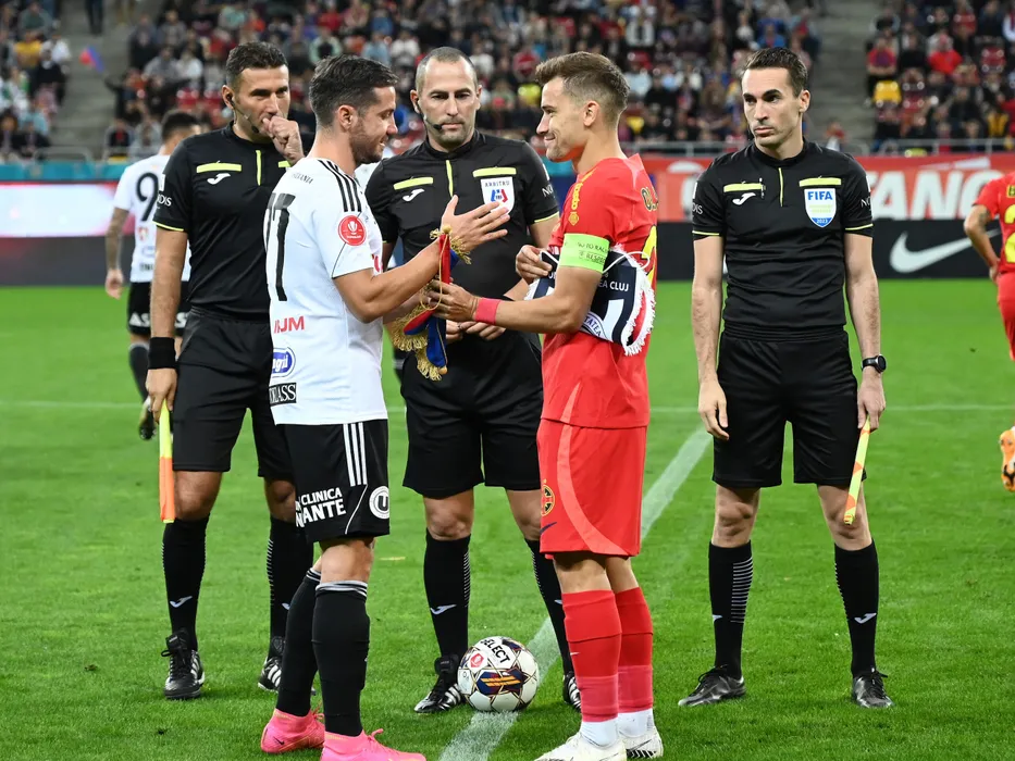 Brigada de arbitrii formata din Mihai Marius Marica, Ionut Coza si Vladimir Urzica alaturi de capitanii Mihaita Alexandru Chipciu si Darius Dumitru Olaru la meciul de fotbal dintre FCSB si Universitatea Cluj, din cadrul Superligii Superbet, desfasurat pe Arena Nationala din Bucuresti, luni 2 octombrie 2023. © FOTO:Razvan Pasarica/SPORT PICTURES