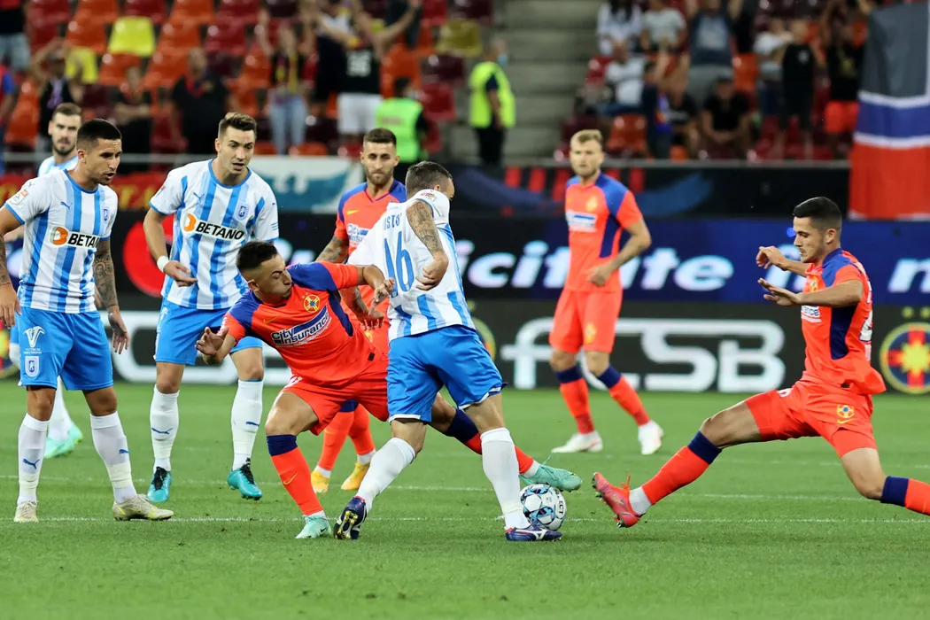 Olimpiu Morutan (S) si Ioan Dumiter (D), de la FCSB, lupta pentru balon cu Dan Nistor (C), de la CS Universitatea Craiova, in meciul de fotbal din etapa a II-a a Ligii 1, disputat pe Arena Nationala din Bucuresti, duminica, 25 iulie 2021. GEORGE FILIP / MEDIAFAX FOTO