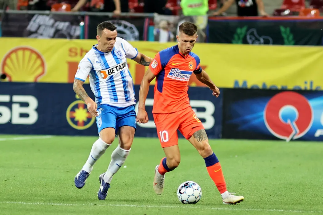 Florin Tanase (D), de la FCSB, lupta pentru balon cu Dan Nistor (S), de la CS Universitatea Craiova, in meciul de fotbal din etapa a II-a a Ligii 1, disputat pe Arena Nationala din Bucuresti, duminica, 25 iulie 2021. GEORGE FILIP / MEDIAFAX FOTO