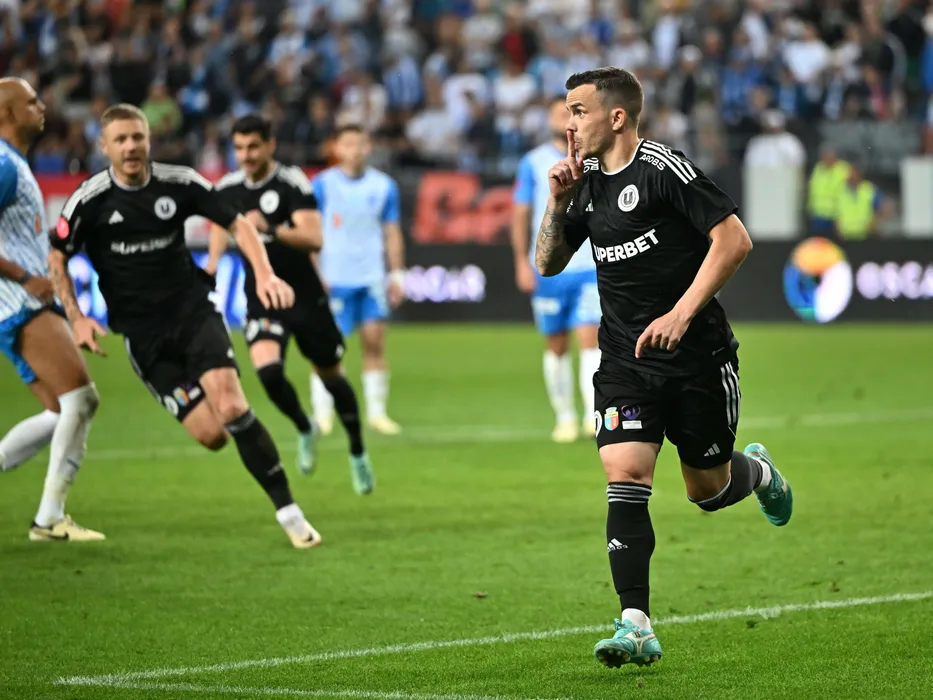 Dan Nicolae Nistor se bucură dupa un gol marcat din penalty în meciul de fotbal dintre Universitatea Craiova si Universitatea Cluj, barajul pentru calificarea in preliminariile Conference League, desfășurat pe Stadionul Ion Oblemenco din Craiova, duminica 26 mai 2024. © FOTO: Răzvan PĂSĂRICĂ/SPORT PICTURES