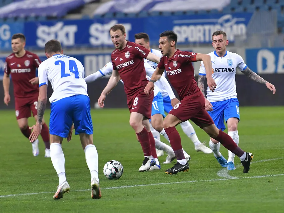 Runar Mar S Sigurjonsson, Mario Camora si Alexandru Mateiu in meciul de fotbal dintre Universitatea Craiova si CFR Cluj, contand pentru Liga 1 Casa Pariurilor, desfasurat fara spectatori pe Stadionul Ion Oblemenco din Craiova, duminica 11 aprilie 2021. © FOTO:Razvan Pasarica/SPORT PICTURES