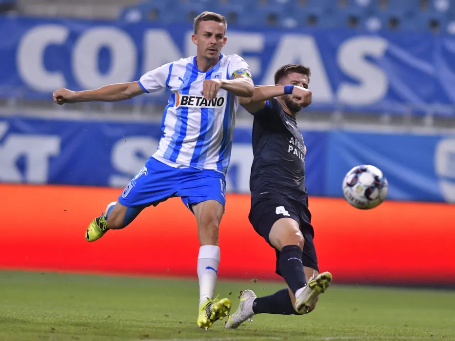Nicusor Silviu Bancu si Marko Roganović in meciul de fotbal dintre Universitatea Craiova si KF Laci, contand pentru Turul 2 preliminar, mansa secunda a Conference League, desfasurat pe Stadionul Ion Oblemenco din Craiova, joi 29 iulie 2021. © FOTO:Razvan Pasarica/SPORT PICTURES