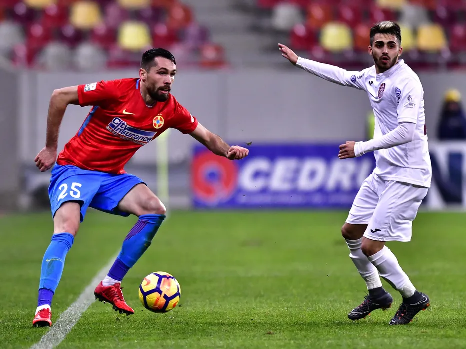 Valerica Gaman si Sebastian Mailat in meciul de fotbal dintre FC Steaua Bucuresti si CFR Cluj, din cadrul Ligii 1 Betano, desfasurat pe Arena Nationala din Bucuresti, sambata 10 februarie 2018. © FOTO Razvan Pasarica/SPORT PICTURES