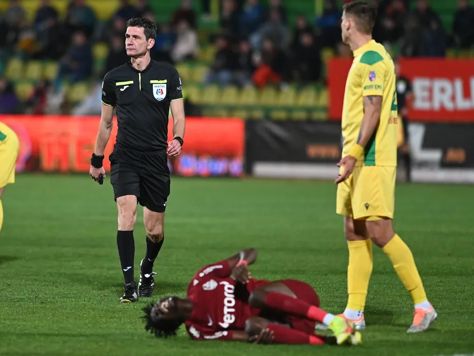 Arbitrul central Horia Gabriel Mladinovici reactioneaza in meciul de fotbal dintre CS Mioveni si CFR Cluj, contand pentru Superliga Superbet, desfasurat pe Stadionul Orasenesc din Mioveni, duminica 13 noiembrie 2022. © FOTO:Razvan Pasarica/SPORT PICTURES