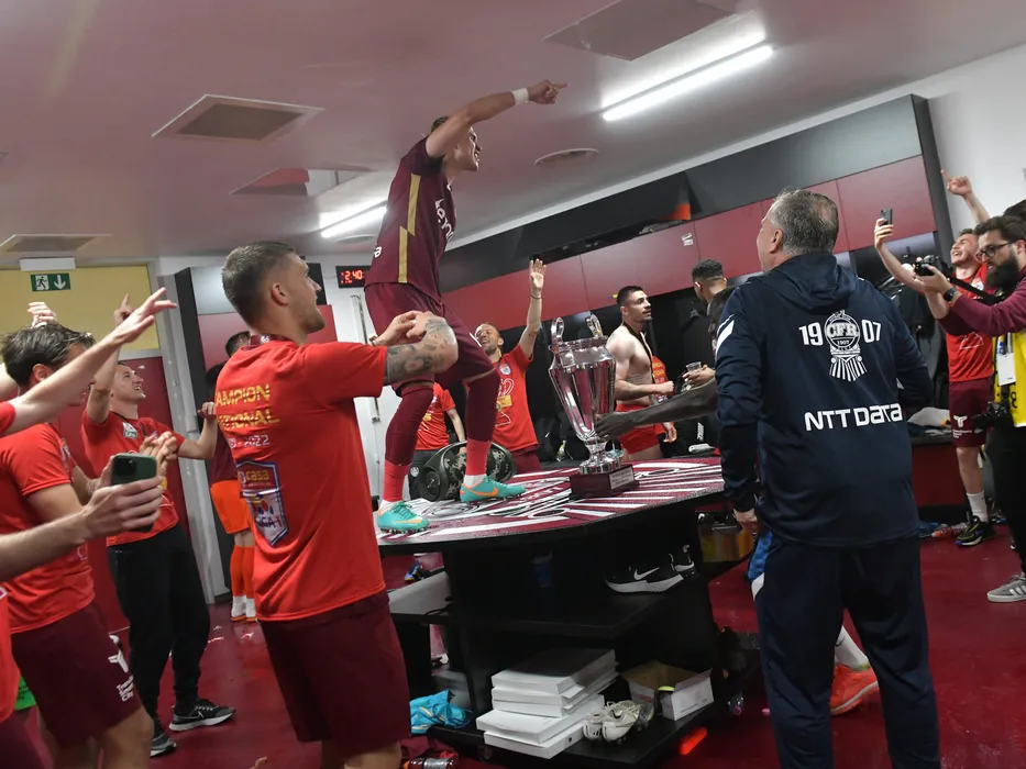 Dan Petrescu alaturi de trofeul si fotbalistii clujeni printre care Cristian Marian Manea pe masa in vestiar dupa castigarea campionatului in urma meciului de fotbal dintre CFR Cluj si Universitatea Craiova, contand pentru Play-off-ul Ligii 1 Casa Pariurilor, desfasurat pe Stadionul CFR Dr. Constantin Radulescu din Cluj Napoca, duminica 15 mai 2022. © FOTO:Razvan Pasarica/SPORT PICTURES