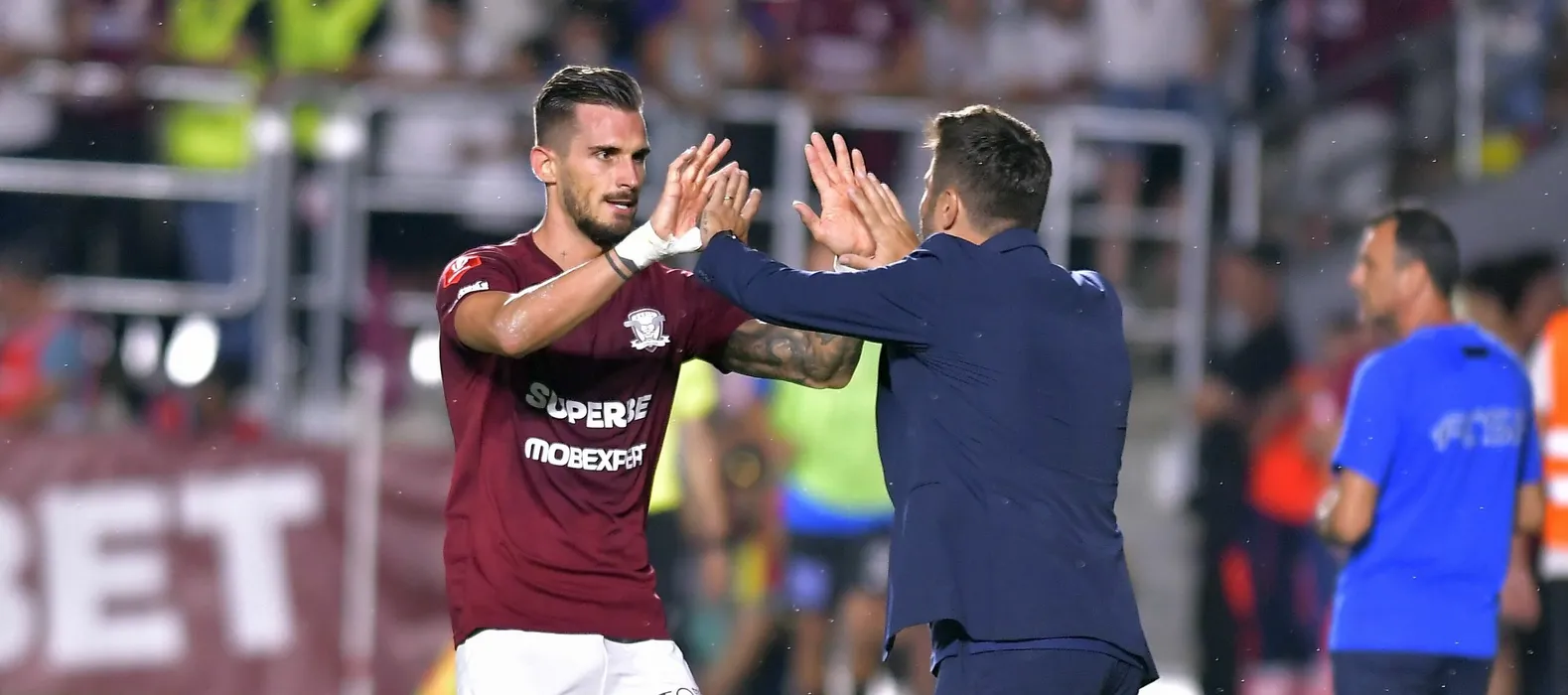 Adrian Mutu il felicita pe Marko Dugandzic dupa un gol marcat in meciul de fotbal dintre Rapid Bucuresti si FCSB, contand pentru Superliga Superbet, desfasurat pe Stadionul Rapid Giulesti din Bucuresti, duminica 24 iulie 2022. © FOTO:Razvan Pasarica/SPORT PICTURES