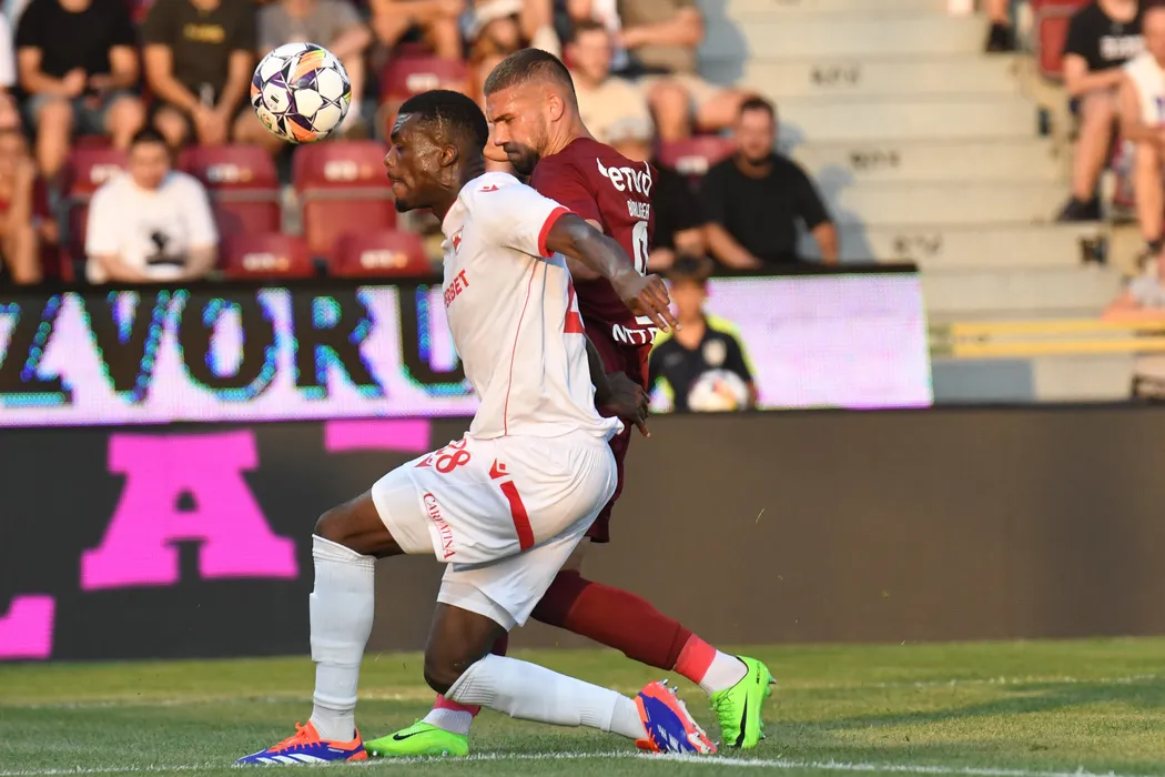 George Daniel Bîrligea și Josue Francis Homawoo în meciul de fotbal dintre FC CFR 1907 Cluj si Dinamo București, contând pentru Superliga Superbet, desfășurat pe Stadionul Dr.Constantin Rădulescu din Cluj-Napoca, duminică 14 iulie 2024. © FOTO: Flaviu BUBOI/SPORT PICTURES
