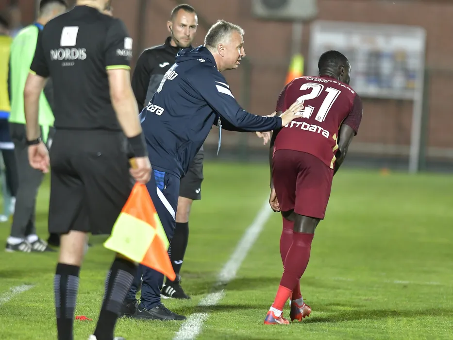 Dan Petrescu il felicita pe Bismark Adjei Boateng dupa un gol marcat in meciul de fotbal dintre FC Voluntari si CFR Cluj, contand pentru Play-off-ul Ligii 1 Casa Pariurilor, desfasurat pe Stadionul Anghel Iordanescu din Voluntari, duminica 24 aprilie 2022. © FOTO:Razvan Pasarica/SPORT PICTURES