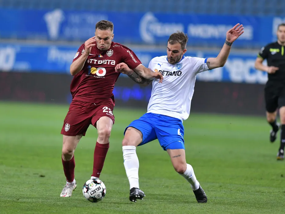 Gabriel Debeljuh si Mihai Alexandru Balasa in meciul de fotbal dintre Universitatea Craiova si CFR Cluj, contand pentru Play-off-ul Ligii 1 Casa Pariurilor, desfasurat fara spectatori pe Stadionul Ion Oblemenco din Craiova, sambata 15 mai 2021. © FOTO:Razvan Pasarica/SPORT PICTURES