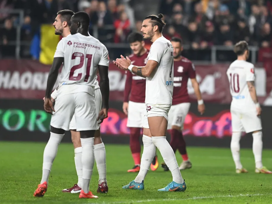 Fotbalistii clujeni Andonie Andrei Burca si Karlo Muhar in meciul de fotbal dintre Rapid Bucuresti si CFR Cluj, contand pentru Superliga Superbet, desfasurat pe Stadionul Rapid Giulesti din Bucuresti, duminica 30 octombrie 2022. © FOTO:Razvan Pasarica/SPORT PICTURES