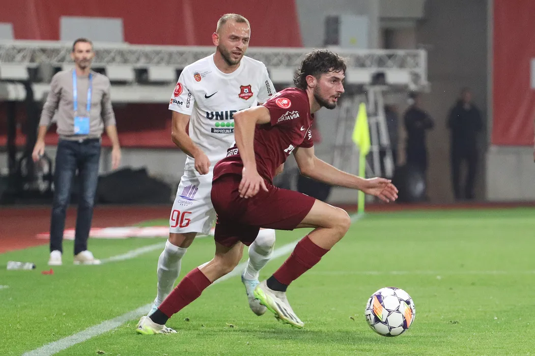 Simao Pedro Rocha Dias Da Rocha și Silviu Nicolae Balaure în meciul de fotbal dintre AFC Hermannstadt Sibiu si FC CFR 1907 Cluj, petru Superliga Superbet, desfășurat pe Stadionul Municipal din Sibiu, sâmbătă 21 septembrie 2024. © FOTO: Valentin MACREA/SPORT PICTURES