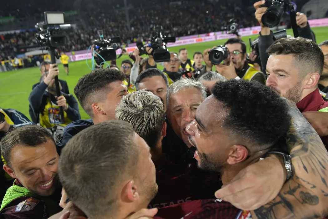 Bucurie clujeana cu Dan Petrescu si Billel Abdel Slem Omrani dupa castigarea campionatului in urma meciului de fotbal dintre CFR Cluj si Universitatea Craiova, contand pentru Play-off-ul Ligii 1 Casa Pariurilor, desfasurat pe Stadionul CFR Dr. Constantin Radulescu din Cluj Napoca, duminica 15 mai 2022. © FOTO:Razvan Pasarica/SPORT PICTURES