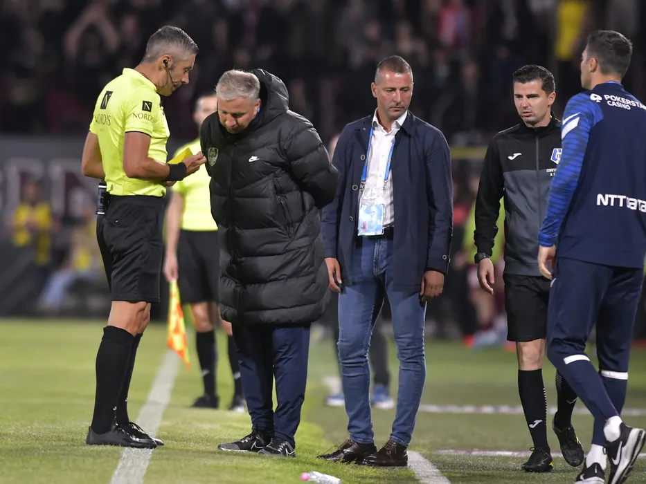 Arbitrul central Radu Petrescu acorda un cartonas galben lui Dan Petrescu sub privirile lui Cristian Panin si Arbitrul de rezerva Bogdan Dumitrache in meciul de fotbal dintre CFR Cluj si Universitatea Craiova, contand pentru Play-off-ul Ligii 1 Casa Pariurilor, desfasurat pe Stadionul CFR Dr. Constantin Radulescu din Cluj Napoca, duminica 15 mai 2022. © FOTO:Razvan Pasarica/SPORT PICTURES