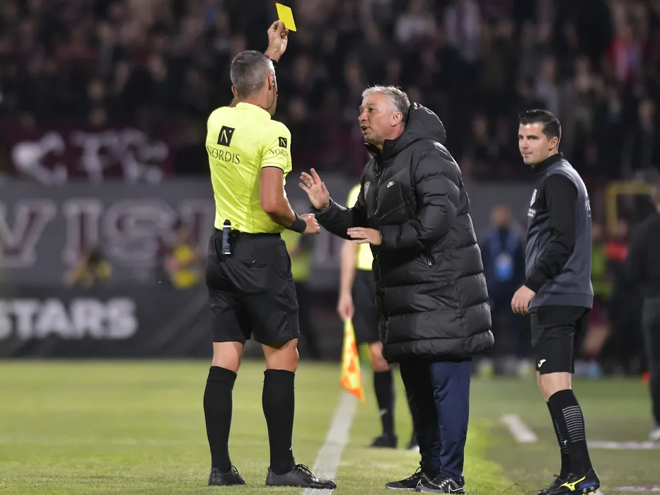Arbitrul central Radu Petrescu acorda un cartonas galben lui Dan Petrescu sub privirile arbitrului de rezerva Bogdan Dumitrache in meciul de fotbal dintre CFR Cluj si Universitatea Craiova, contand pentru Play-off-ul Ligii 1 Casa Pariurilor, desfasurat pe Stadionul CFR Dr. Constantin Radulescu din Cluj Napoca, duminica 15 mai 2022. © FOTO:Razvan Pasarica/SPORT PICTURES