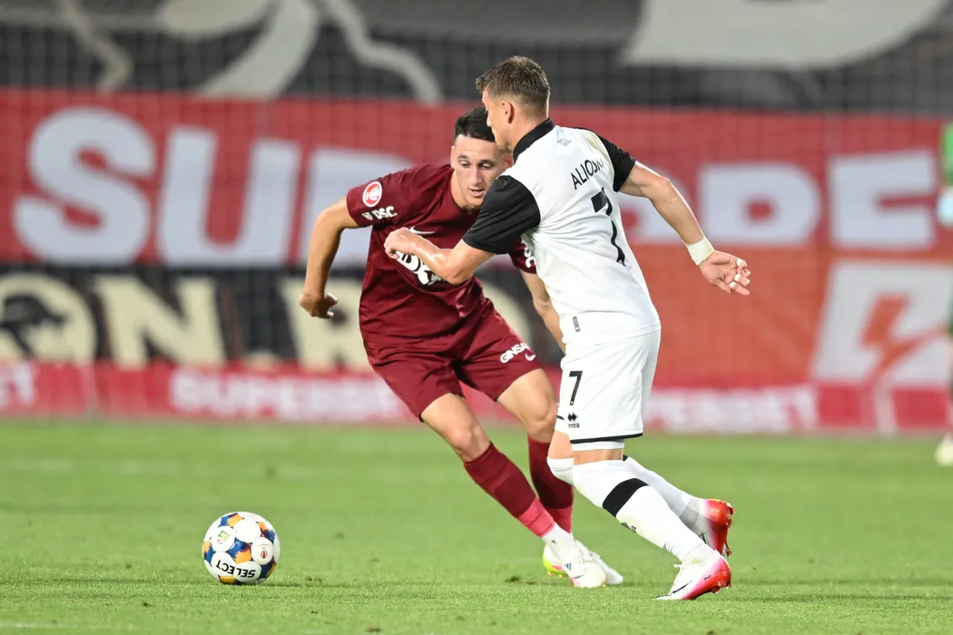 Alin Razvan Fica si Ezgjan Alioski in meciul de fotbal dintre FC CFR 1907 Cluj si FC Lugano, contand pentru UEFA League al doilea tur preliminar, desfasurat pe Stadionul Dr. Constantin Rădulescu din Cluj-Napoca, joi 31 iulie 2025. © FOTO: Flaviu Buboi/SPORT PICTURES
