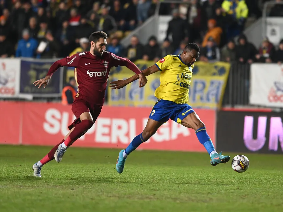 Denis Kolinger si Okechukwu Christian Irobiso in meciul de fotbal dintre Petrolul Ploiesti si CFR Cluj, contand pentru Superliga Superbet, desfasurat pe Stadionul Ilie Oana din Ploiesti, luni 27 februarie 2023. © FOTO:Razvan Pasarica/SPORT PICTURES