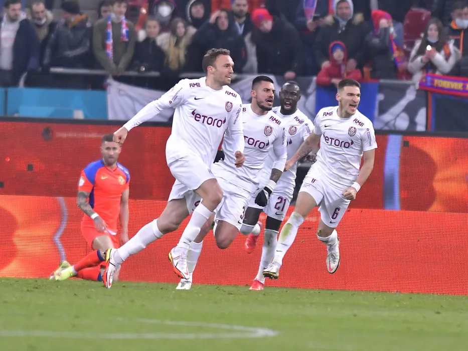 Bucurie a fotbalistilor clujeni dupa un gol marcat cu Gabriel Debeljuh, Andonie Andrei Burca, Bismark Adjei Boateng si Daniel Graovac in meciul de fotbal dintre FCSB si CFR Cluj, contand pentru Liga 1 Casa Pariurilor, desfasurat pe Arena Nationala din Bucuresti, duminica 23 ianuarie 2022. © FOTO:Razvan Pasarica/SPORT PICTURES