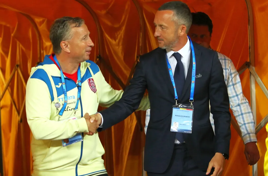 Antrenorul formatiei CFR Cluj, Dan Petrescu (S) si Mihai "Meme" Stoica, directorul sportiv al FCSB, isi strang mainile inaintea partidei dintre cele doua formatii, partida desfasurata in cadrul etapei a 7-a a play-off-ul Ligii I la fotbal, duminica 19 aprilie 2018, pe Arena Nationala din Bucuresti. GEORGE FLUSTER / MEDIAFAX FOTO