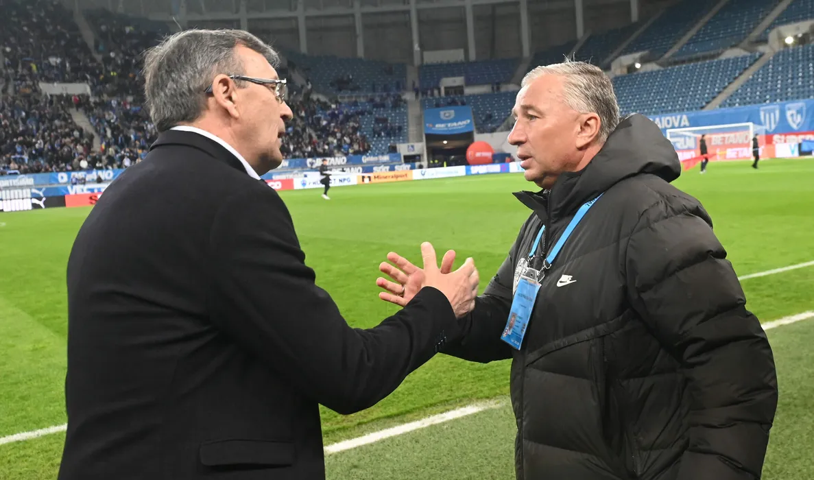 Cei doi antrenori Eugen Neagoe si Dan Petrescu se saluta inaintea meciului de fotbal dintre Universitatea Craiova si CFR Cluj, contand pentru Play-off-ul Superligii Superbet, desfasurat pe Stadionul Ion Oblemenco din Craiova, duminica 2 aprilie 2023. © FOTO:Razvan Pasarica/SPORT PICTURES