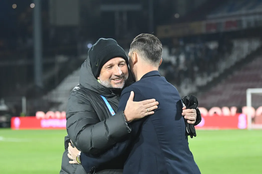 Cei doi antrenori Dan Vasile Petrescu si Matei Mirel Radoi se saluta inaintea meciului de fotbal dintre FC CFR 1907 Cluj si Universitatea Craiova, contand pentru Superliga Superbet - Play-Off, desfasurat pe Stadionul Dr.Constantin Radulescu din Cluj-Napoca, luni 7 aprilie 2025. © FOTO: Flaviu Buboi/SPORT PICTURES
