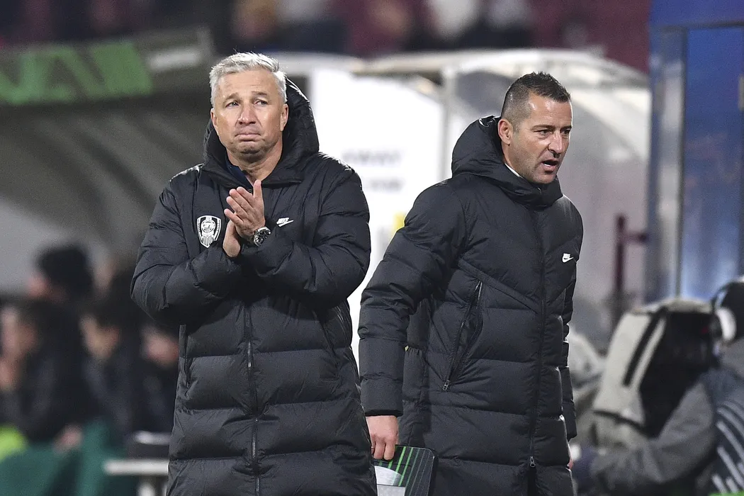 CFR's coach Dan Petrescu applauds after his team scored their second goal during the Europa Conference League, group D, soccer match between CFR Cluj and FK Jablonec at the Constantin Radulescu Stadium in Cluj, Romania, Thursday, Dec. 9, 2021. (AP Photo/Raed Krishan)
