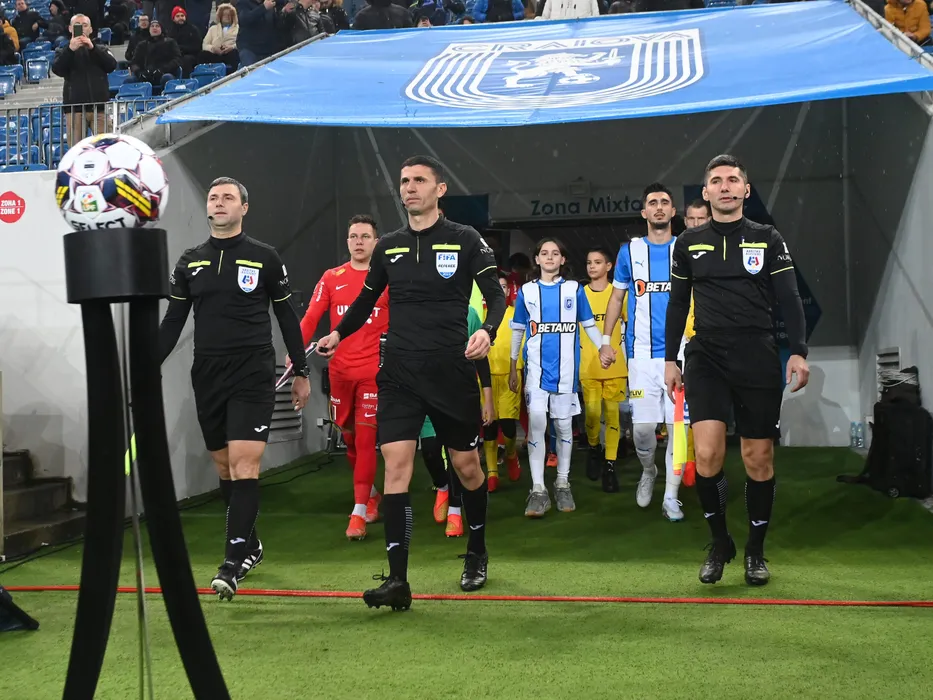Brigada de arbitrii formata din Bogdan Mihai Gheorghe, Marcel Birsan si Mircea Orbulet alaturi de capitanii Ionut Petrisor Petrescu si Andrei Virgil Ivan in meciul de fotbal dintre Universitatea Craiova si FC Hermannstadt, contand pentru Superliga Superbet, desfasurat pe Stadionul Ion Oblemenco din Craiova, sambata 28 ianuarie 2023. © FOTO:Razvan Pasarica/SPORT PICTURES