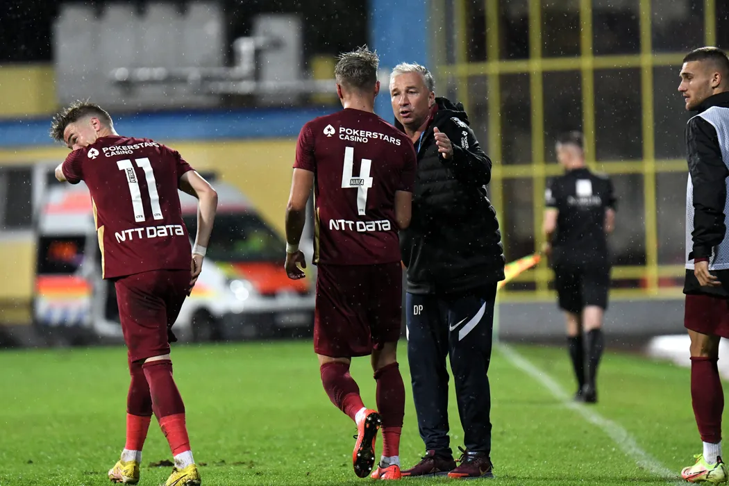 Dan Petrescu, antrenorul echipei CFR Cluj, il felicita pe Cristian Manea (nr. 4), dupa ce acesta a inscris un gol in meciul de fotbal contra echipei FC Petrolul din etapa a XII-a a Superligii, disputat pe stadionul Gaz Metan din Medias, sambata, 1 octombrie 2022. FLAVIU BUBOI / MEDIAFAX FOTO