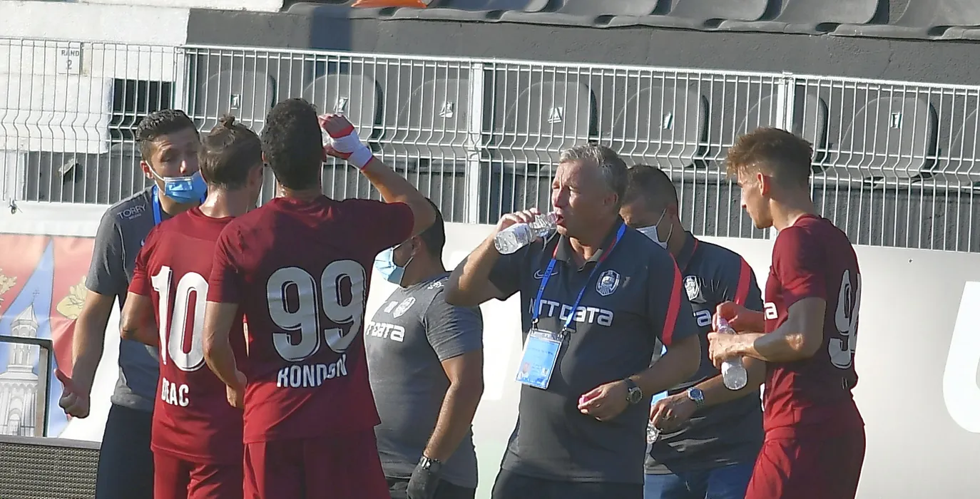 Dan Petrescu alaturi de fotbalistii clujeni la o pauza de hidratare in meciul de fotbal dintre Academica Clinceni si CFR Cluj, contand pentru Liga 1 Casa Pariurilor, desfasurat pe Clinceni Arena din Clinceni, duminica 23 august 2020. © FOTO:Razvan Pasarica/SPORT PICTURES