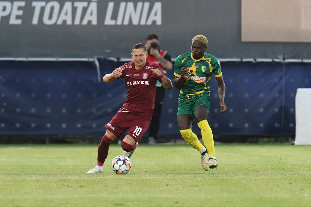 Ciprian Ioan Deac și Leonard Gweth în meciul de fotbal dintre FC CFR 1907 Cluj si FC Neman Grodno, contând pentru Turul 2 de calificare Conference League, desfășurat pe Stadionul Dr.Constantin Rădulescu din Cluj-Napoca, joi 25 iulie 2024. © FOTO: Flaviu BUBOI/SPORT PICTURES