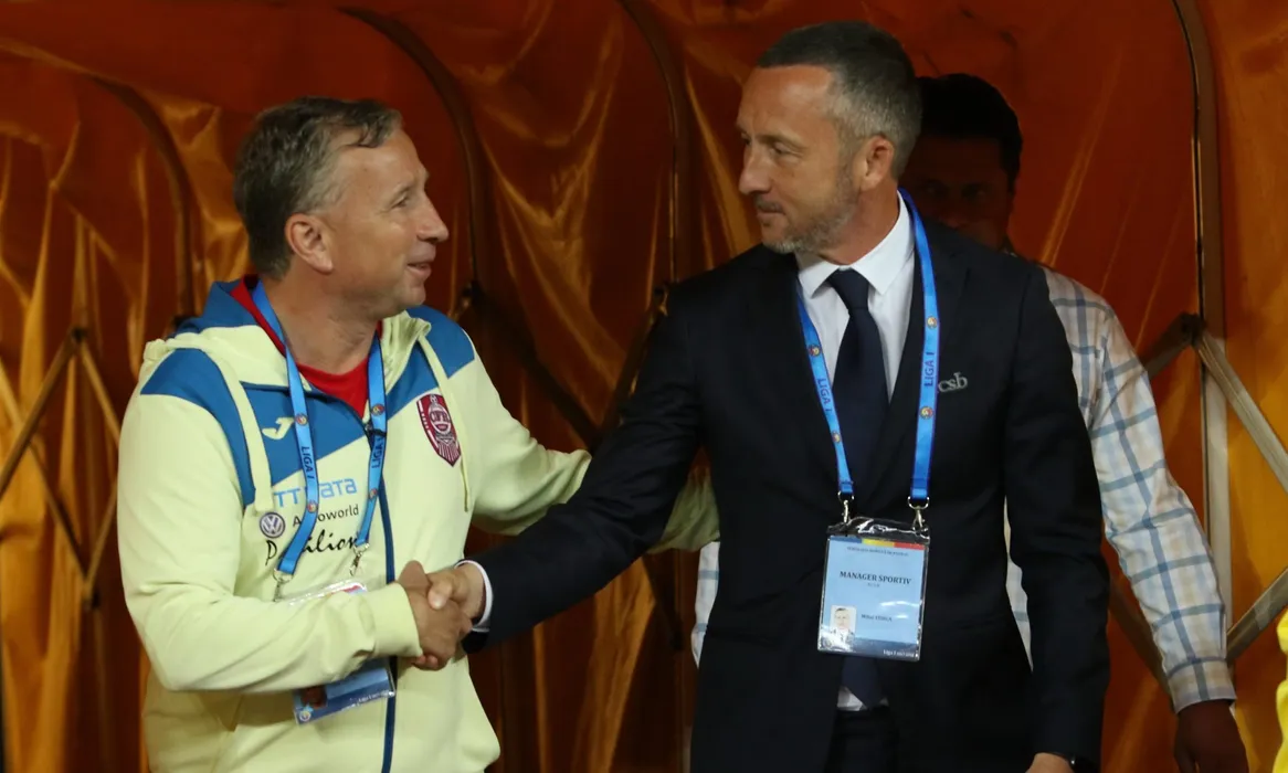 Antrenorul formatiei CFR Cluj, Dan Petrescu (S) si Mihai "Meme" Stoica, directorul sportiv al FCSB, isi strang mainile inaintea partidei dintre cele doua formatii, partida desfasurata in cadrul etapei a 7-a a play-off-ul Ligii I la fotbal, duminica 19 aprilie 2018, pe Arena Nationala din Bucuresti. GEORGE FLUSTER / MEDIAFAX FOTO