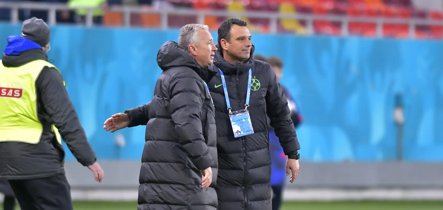 Cei doi antrenori Dan Petrescu si Toni Petrea se saluta dupa meciul de fotbal dintre FCSB si CFR Cluj, contand pentru Liga 1 Casa Pariurilor, desfasurat pe Arena Nationala din Bucuresti, duminica 23 ianuarie 2022. © FOTO:Razvan Pasarica/SPORT PICTURES