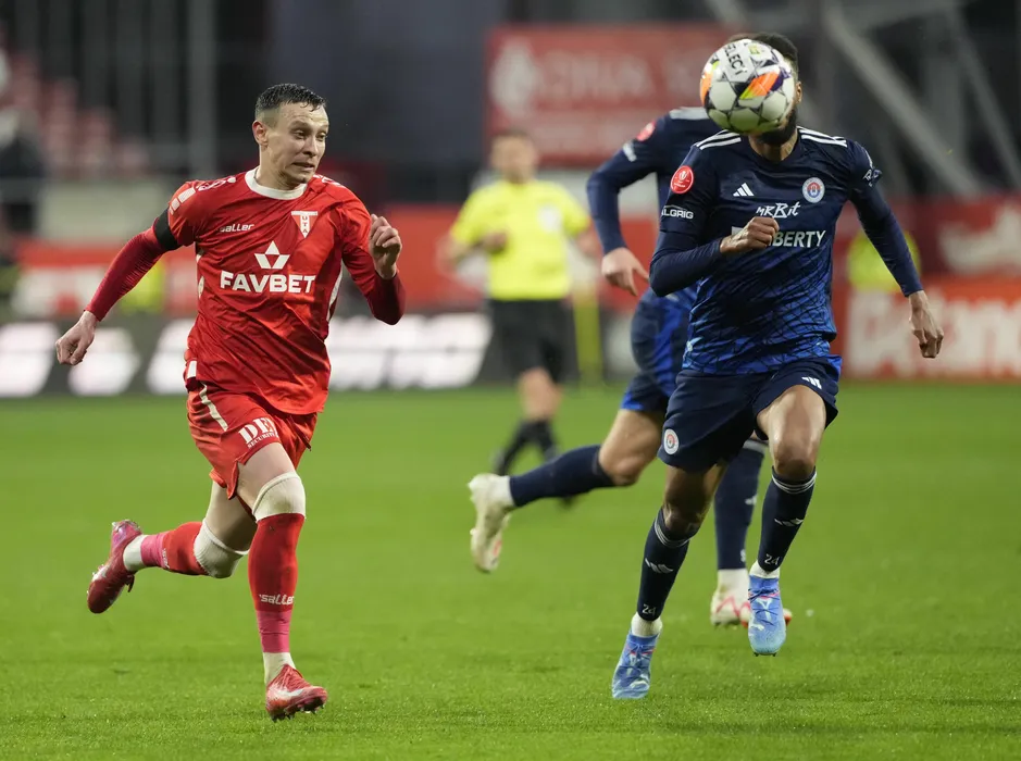 Valentin Ionut Costache si Yves Angha Martin in meciul de fotbal dintre UTA Arad si SC Otelul Galati, contand pentru Superliga Superbet - Play-Out, desfasurat pe Arena Francisc Neuman din Arad, duminica 16 martie 2025. © FOTO: Alexandra Fechete/SPORT PICTURES