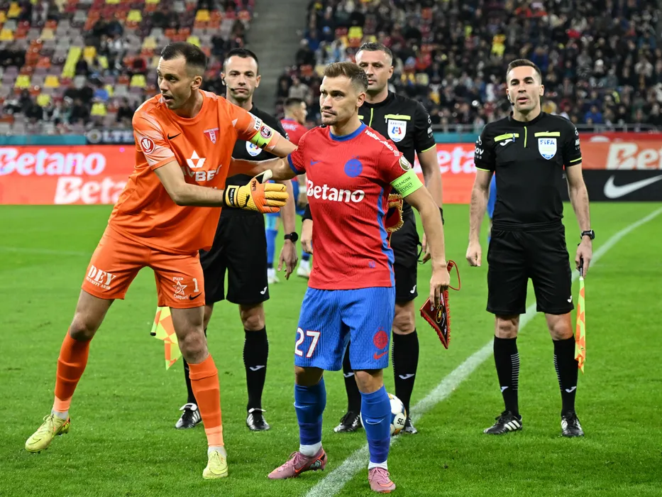 Brigada de arbitrii formata din Mihai Marius Marica, Andrei Moroita si Ioan Alexandru Corb alaturi de capitanii Deyan Iliev si Darius Dumitru Olaru in meciul dintre FCSB si UTA Arad, contand pentru Superliga Superbet, desfasurat pe Arena Nationala din Bucuresti, duminica 26 octombrie 2025. © FOTO:Razvan Pasarica/SPORT PICTURES