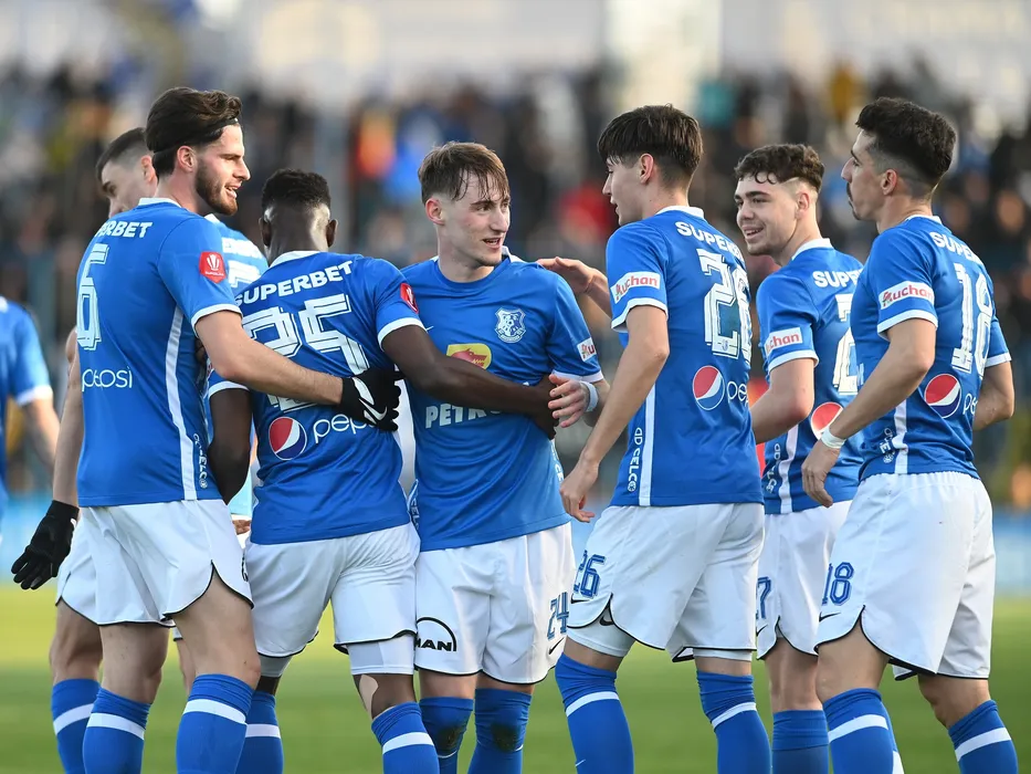 Bucurie a fotbalistilor constanteni dupa un gol marcat cu Tudor Cristian Baluta, Constantin Grameni, Adrian Mazilu, Sebastian Andrei Borza si Andrei Viorel Artean in meciul de fotbal dintre Farul Constanta si Sepsi OSK Sfantu Gheorghe, contand pentru Play-off-ul Superligii Superbet, desfasurat pe Stadionul central al Academiei Gheorghe Hagi din Ovidiu, duminica 19 martie 2023. © FOTO:Razvan Pasarica/SPORT PICTURES