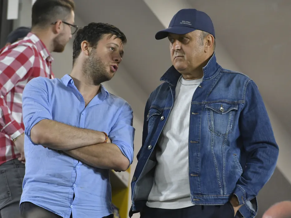 Victor Angelescu si Dan Sucu discuta in tribuna la meciul de fotbal dintre Romania si Muntenegru, contand pentru Liga Natiunilor, desfasurat pe Stadionul Rapid Giulesti din Bucuresti, marti 14 iunie 2022. © FOTO:Razvan Pasarica/SPORT PICTURES