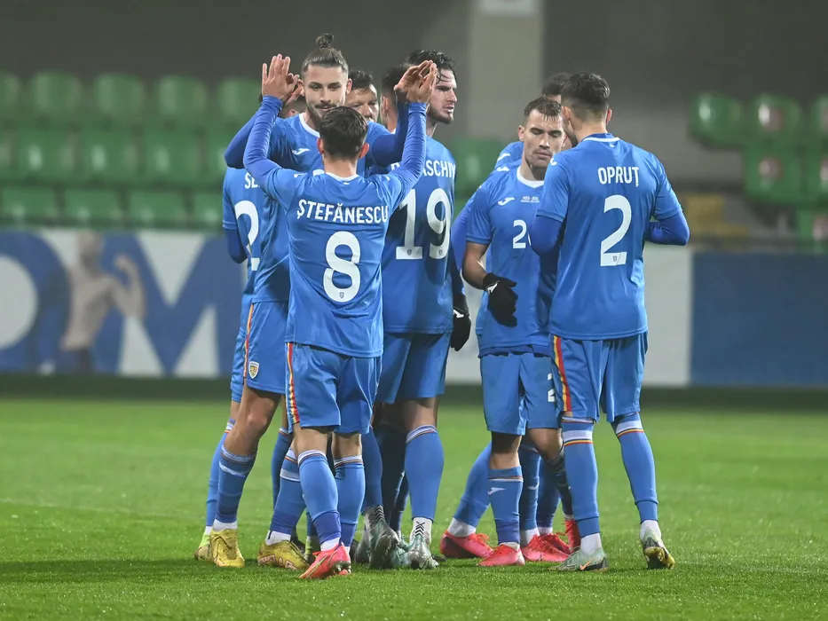 Radu Drăgușin, Marius Ștefănescu, Tudor Băluță si Darius Olaru se bucura dupa un gol marcat in meciul amical de fotbal dintre Moldova si Romania, desfasurat pe Stadionul Zimbru din Chisinau, duminica 20 noiembrie 2022. © FOTO:Razvan Pasarica/SPORT PICTURES