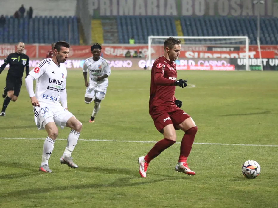 Louis Munteanu si Alexandru Tiganasu in meciul de fotbal dintre FC Botosani si FC CFR 1907 Cluj, din cadrul Superligii Superbet, desfasurat pe Stadionul Municipal din Botosani, duminica 19 ianuarie 2025. © FOTO: Ionut Tabultoc/SPORT PICTURES
