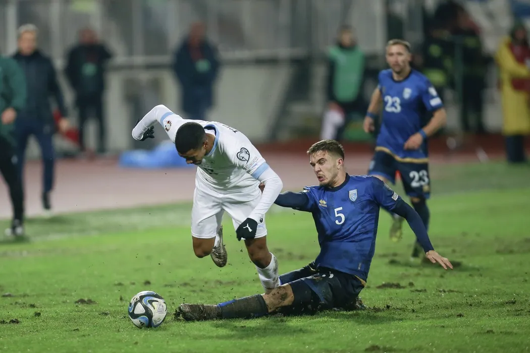 Kosovo's Ilir Krasniqi, right, vies for the ball with Israel's Idan Gorno during the Euro 2024 group I qualifying soccer match between Kosovo and Israel at the Fadil Vokrri stadium in Pristina, Kosovo, Sunday, Nov. 12, 2023.,Image: 821673599, License: Rights-managed, Restrictions: This content is intended for editorial use only. For other uses, additional clearances may be required., Model Release: no, Pictured: Idan Gorno,Ilir Krasniqi,Israel