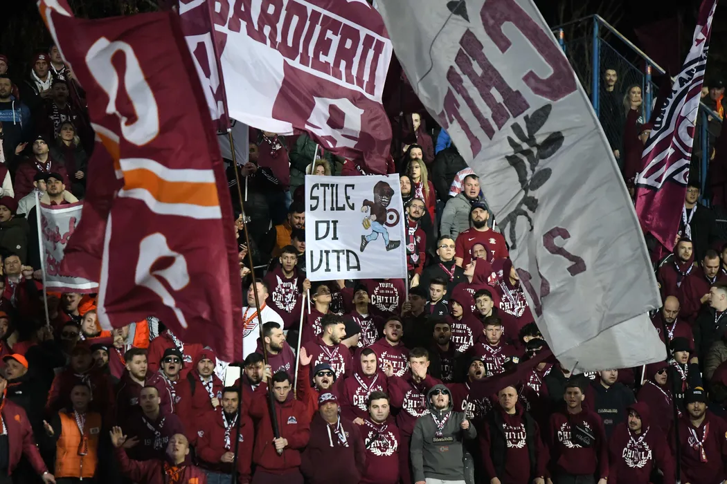 Galeria giuleșteană cu steaguri și fulare își încurajează favoriții în meciul de fotbal dintre Poli Iași si FC Rapid 1923 București contând pentru SuperLiga Superbet, desfășurat pe Stadionul Emil Alexandrescu din Iași, sâmbătă 24februarie 2024. © FOTO: Tudi/SPORT PICTURES