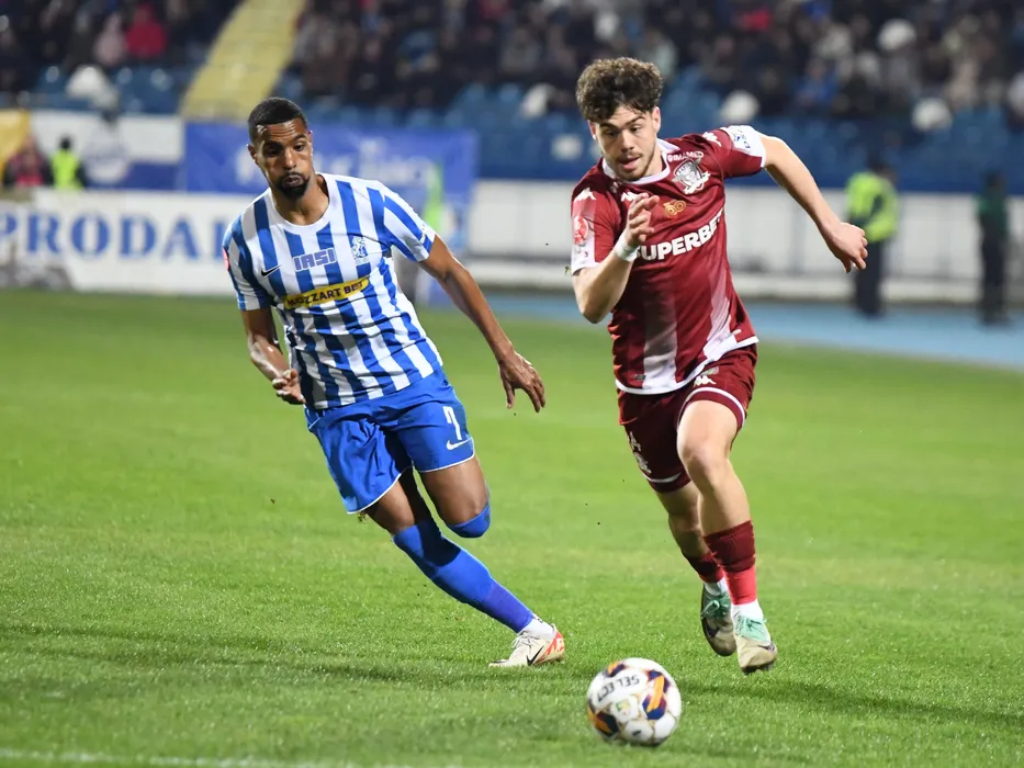 Sebastian Andrei Borza și Adel Bettaieb în meciul de fotbal dintre Poli Iași si FC Rapid 1923 București contând pentru SuperLiga Superbet, desfășurat pe Stadionul Emil Alexandrescu din Iași, sâmbătă 24februarie 2024. © FOTO: Tudi/SPORT PICTURES