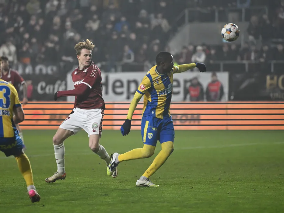 Tobias Christensen si Danel Jordan Dongmo in meciul de fotbal dintre Rapid Bucuresti si Petrolul Ploiesti, din cadrul Superligii Superbet, desfasurat pe Superbet Arena-Giulesti din Bucuresti, vineri 6 februarie 2026. © FOTO:Razvan Pasarica/SPORT PICTURES