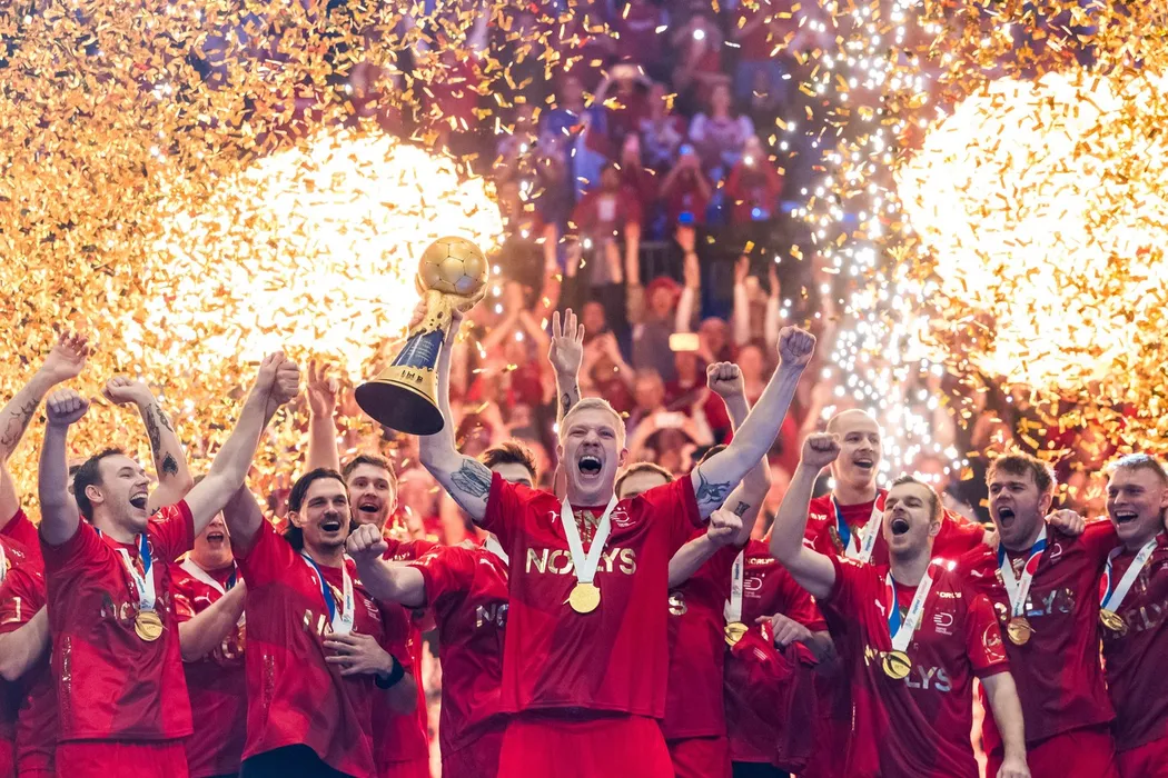 Players of Denmark celebrate with the trophy after the 2025 IHF World Men's Handball Championship final between Croatia and Denmark on February 2, 2025 in Oslo.