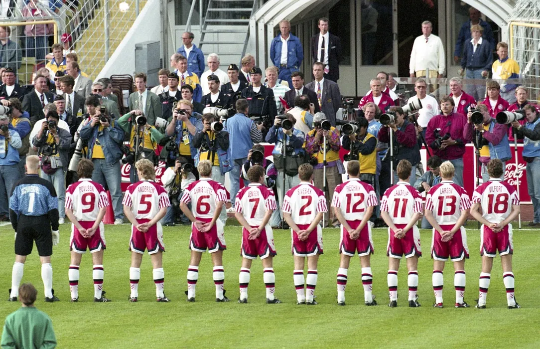 June 22, 1992 - G…Teborg, SVERIGE - 920622 Fotboll, EM92, Semifinal, Holland - Danmark: Peter Schmeichel, mŒlvakt, Flemming Povlsen, Henrik Andersen, Kim Christofte, John Faxe Jensen, John Sivebaek, Torben Piechnik, Brian Laudrup, Henrik Larsen, Kim Vilfort, Danmark..©ÊBildbyran - EM92,Image: 292085135, License: Rights-managed, Restrictions: * Austria, France, Holland, Norway, Sweden, OUT *, Model Release: no, Credit line: Profimedia