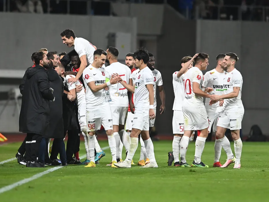 Bucurie a fotbalistilor sibieni dupa un gol marcat cu Paul Marius Antoche, Raul Marian Oprut, Mino Sota, George Daniel Paraschiv si Ionut Petrisor Petrescu in meciul de fotbal dintre FC Hermannstadt si Farul Constanta, contand pentru Superliga Superbet, desfasurat pe Stadionul Municipal din Sibiu, sambata 10 decembrie 2022. © FOTO:Razvan Pasarica/SPORT PICTURES
