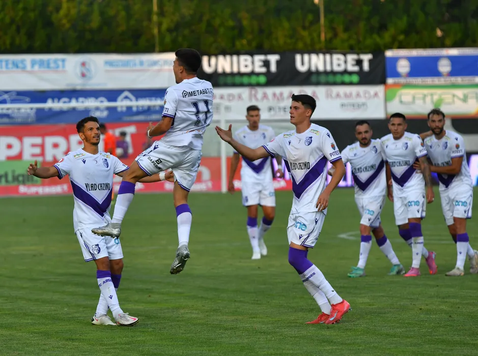 Fotbalistii argeseni Gabriel Dorinel Oancea, Mario Cristian Tudose se bucura dupa un gol marcat de Yanis Christian Nikolas Pirvu in meciul de fotbal dintre FC Arges si FK Csikszereda Miercurea Ciuc, contand pentru Superliga Superbet, desfasurat pe Stadionul Orasenesc din Mioveni, sambata 2 august 2025. © FOTO:Mihai Nitoiu/SPORT PICTURES