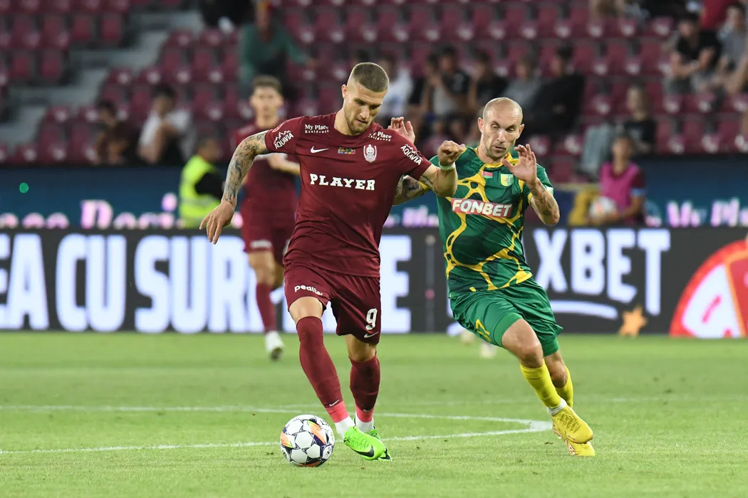 George Daniel Bîrligea și Mikhail Kozlov în meciul de fotbal dintre FC CFR 1907 Cluj si FC Neman Grodno, contând pentru Turul 2 de calificare Conference League, desfășurat pe Stadionul Dr.Constantin Rădulescu din Cluj-Napoca, joi 25 iulie 2024. © FOTO: Flaviu BUBOI/SPORT PICTURES