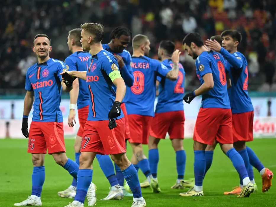 Fotbaliștii ros-albastrii Marius Ștefănescu si Darius Dumitru Olaru se bucură dupa un gol marcat in meciul de fotbal dintre FCSB si Unirea Slobozia, din cadrul Superligii Superbet, desfasurat pe Arena Nationala din Bucuresti, duminica 24 noiembrie 2024. © FOTO:Razvan Pasarica/SPORT PICTURES
