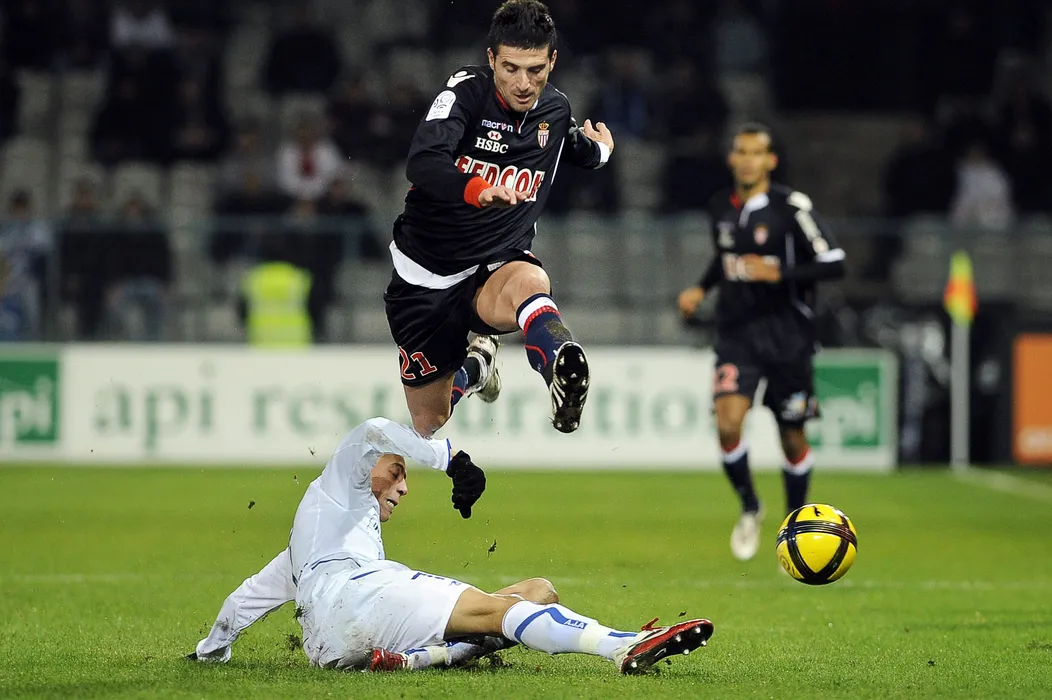 Monaco's Romanian forward Daniel Niculae (C) is tackled by Auxerre's Moroccan midfielder Kamel Chafni (L) during their French L1 football match Auxerre vs Monaco on January 15, 2011 at the Abbe Deschamps stadium in Auxerre. AFP PHOTO / JEFF PACHOUD